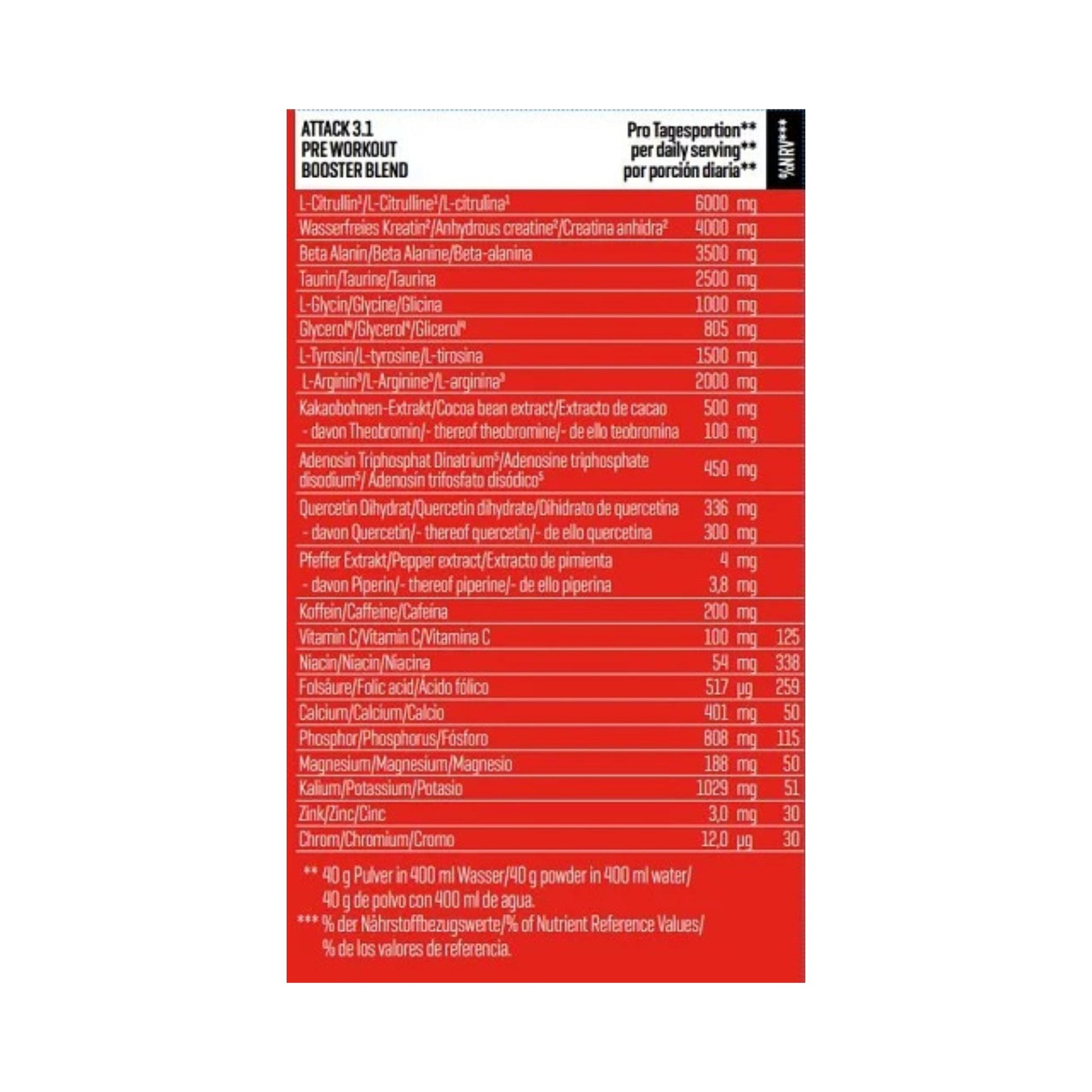 L-Citrullin, Maltodextrin, wasserfreies Kreatin, Kaliumphosphat, Beta-Alanin, Taurin, L-Arginin, Magnesiumcitrat, Calciumcitrat, Säuerungsmittel (Citronensäure), Aroma (enthält Laktose), L-Tyrosin, Glycin (enthält Gluten), Glycerol, Kakaobohnen-Extrakt, Adenosintriphosphat-Dinatrium, Quercetin-Dihydrat, Trennmittel (Siliciumdioxid), Süßungsmittel (Acesulfam K, Sucralose, Natriumcyclamat, Saccharin), Koffein, Vitamin C, Niacin, Pfefferextrakt, Zinkoxid, Folsäure, Chrom(III)-chlorid.
