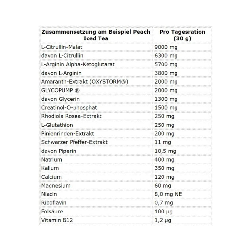 L-Citrullin-Malat (2:1), L-Arginin-Alpha-Ketoglutarat (2:1), Glycopump® (65 % Glycerinpulver, Trennmittel (Siliciumdioxid)), Amaranth-Extrakt (OXYSTORM®), Creatinol-O-Phosphat, Natriumcitrat, Kaliumcitrat, Calciumcitrat, Magnesiumcitrat, Maltodextrin, Rhodiola Rosea-Extrakt, L-Glutathion, Pinienrinden-Extrakt, Schwarzer Pfeffer-Extrakt, Saeuerungsmittel (Citronensaeure), Suessungsmittel (Sucralose, Acesulfam K), Niacin (Nicotinamid), Riboflavin, Folsäure ((6S)-5-Methyltetrahydrofolsaeure, Glucosaminsalz), Vitamin B12 (Methylcobalamin), Aroma, faerbendes Lebensmittel / Farbstoffe je nach Sorte.