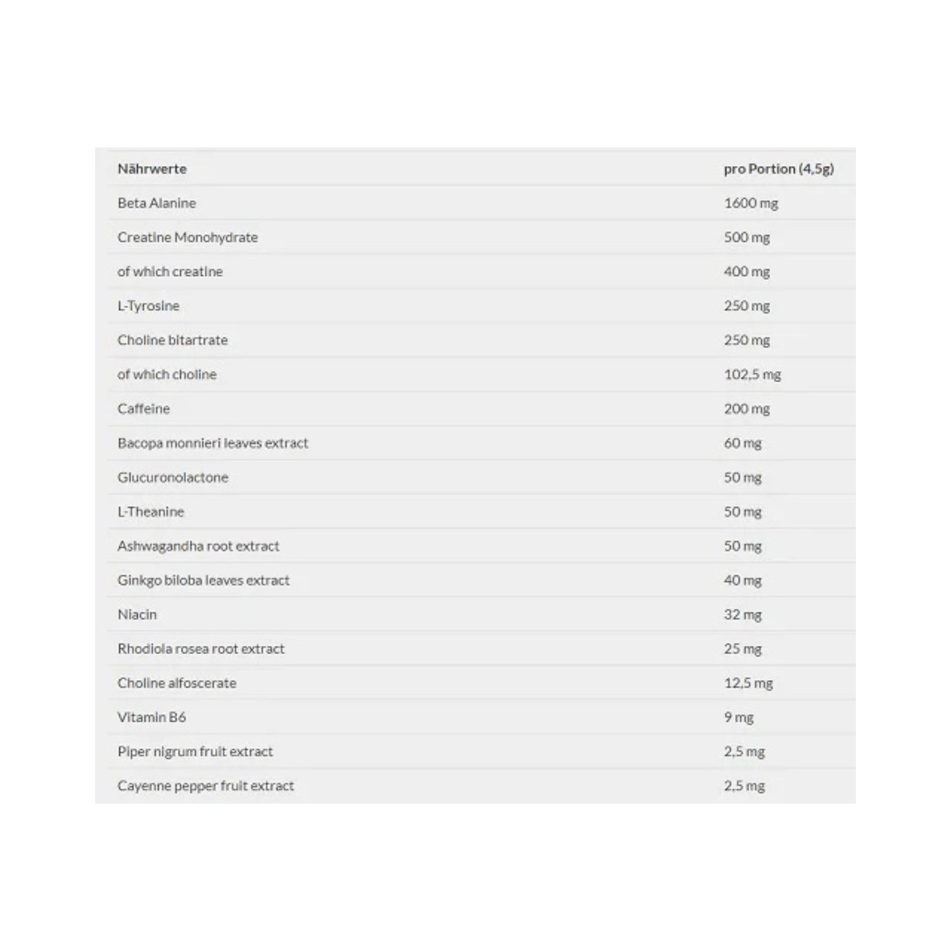 Beta-Alanin, Kreatin-Monohydrat, L-Tyrosin, Cholinbitartrat, Koffein, Bacopa monnieri Blattextrakt, Glucuronolacton, L-Theanin, Ashwagandha-Wurzelextrakt, Ginkgo-biloba-Blattextrakt, Niacin, Rhodiola-rosea-Wurzelextrakt, Cholin-Alphoscerat, Vitamin B6, Piper-nigrum-Fruchtextrakt, Cayennepfeffer-Fruchtextrakt.
