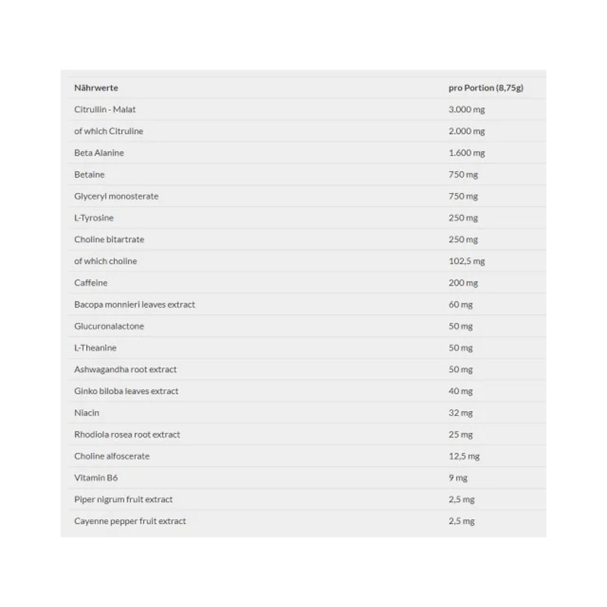 Citrullin-Malat, Beta-Alanin, Betain, Glycerylmonostearat, L-Tyrosin, Cholinbitartrat, Taurin, Bacopa-monnieri-Blattextrakt, Aromen, Süßungsmittel.