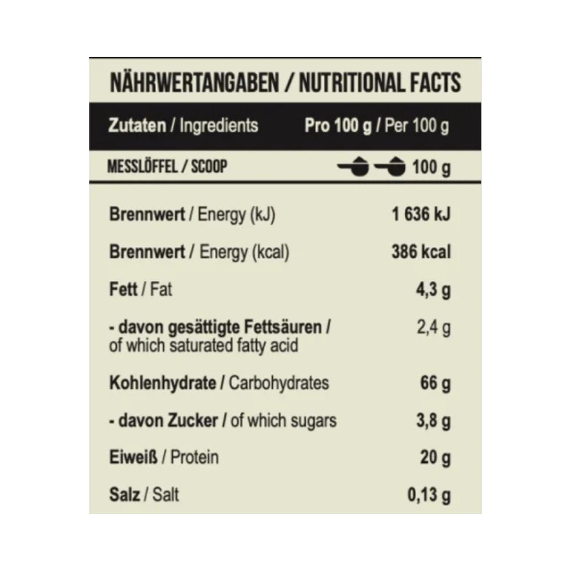 Maltodextrin, Wachsmais, Molkenproteinkonzentrat (aus Milch), Hafermehl, Kakaopulver, Schokoladenaroma, Süßungsmittel (Sucralose).