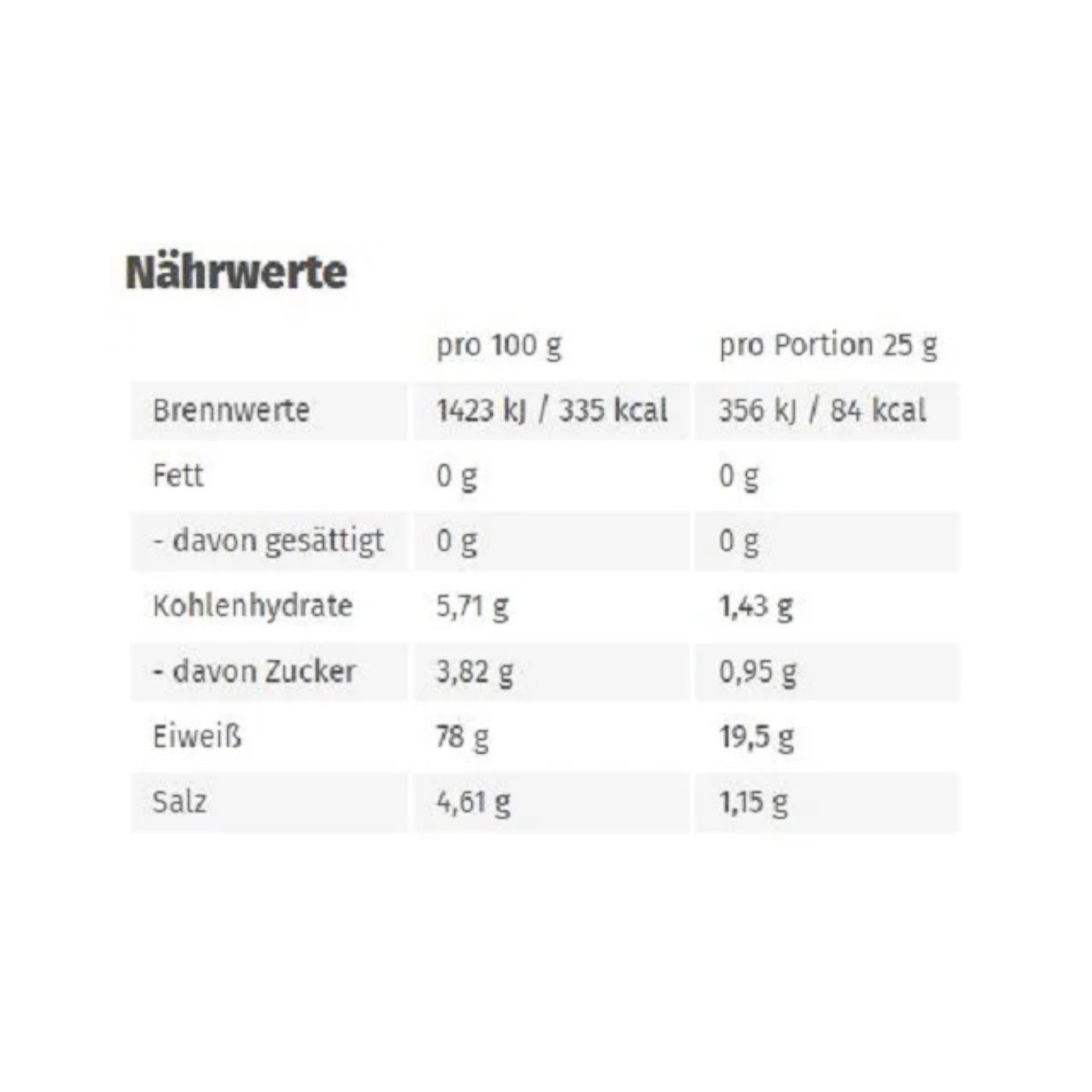 Jede Portion liefert ca. 19,5 g Protein bei nur 84 kcal, mit sehr geringem Fett- und Kohlenhydratanteil. Das Produkt ist zuckerfrei und laktosefrei und eignet sich besonders für Menschen mit Laktoseintoleranz oder Unverträglichkeiten gegenüber Milchproteinen.