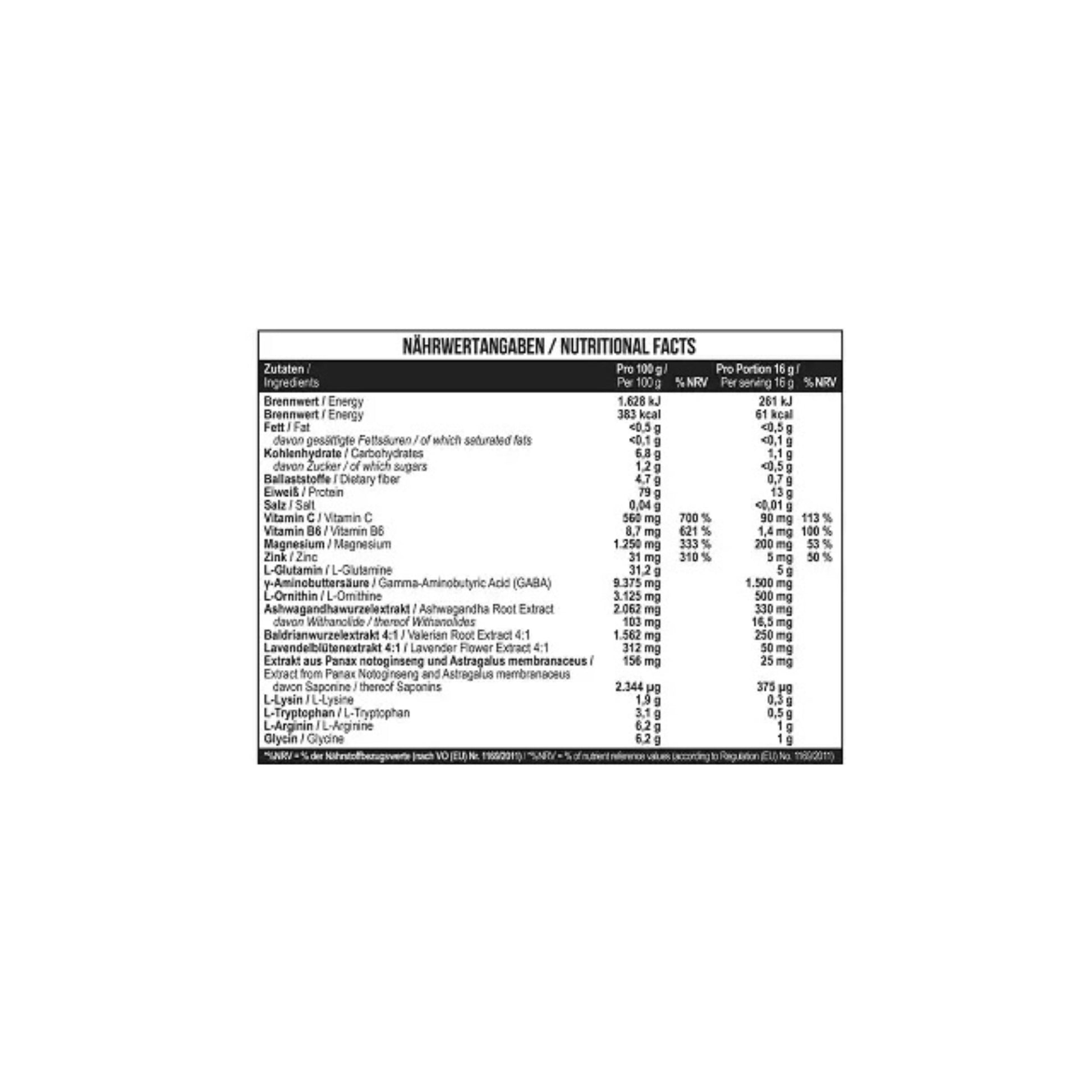 L-Glutamin, Säuerungsmittel (Citronensäure), γ-Aminobuttersäure, Magnesiumbisglycinat, L-Argininhydrochlorid, Glycin, Inulin, L-Ornithinhydrochlorid, Aroma, L-Tryptophan, Trennmittel (Siliciumdioxid), L-Lysin-Monohydrochlorid, Ashwagandhawurzelextrakt (KSM-66®), färbendes Lebensmittel (Rote-Bete-Saftpulver), Baldrianwurzelextrakt, L-Ascorbinsäure, Süßungsmittel (Sucralose, Acesulfam-K), Lavendelblütenextrakt, Extrakt aus Panax notoginseng und Astragalus membranaceus (AstraGin®), Zinkbisglycinat, Pyridoxinhydrochlorid.