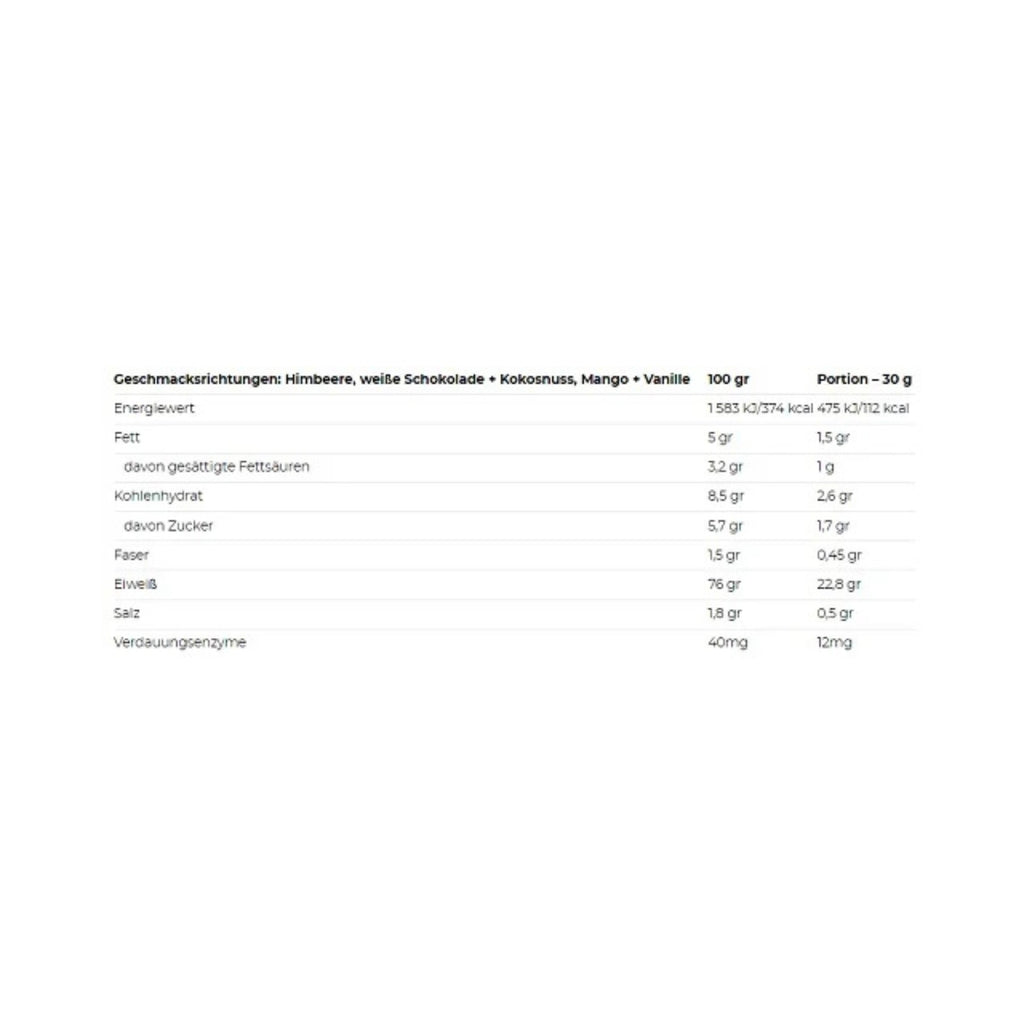 Molkenproteinkonzentrat, Molkenproteinisolat, Kakao, Aromen, Weizenfaser (glutenfrei), Stabilisatoren (Akaziengummi, Xanthan), Trennmittel (Siliciumdioxid), Natriumchlorid, Enzymkomplex DigeZyme® (Amylase, Protease, Laktase, Lipase, Cellulase), Süßungsmittel (Sucralose, Steviolglykoside).