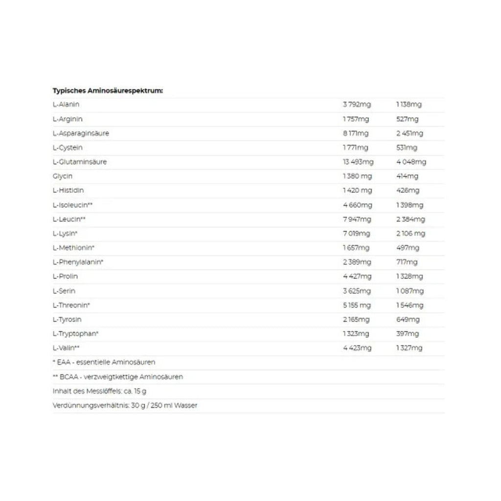 30 g Pulver mit 250 ml Wasser mischen. Je nach Bedarf 1–3 Portionen täglich.