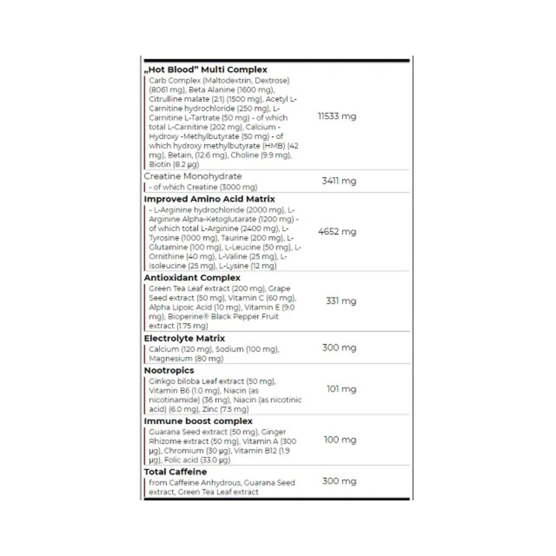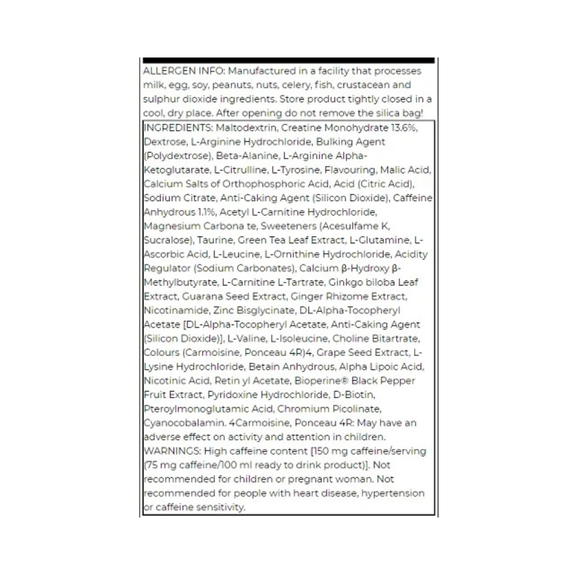 Kohlenhydratmischung (u. a. Maltodextrin, Dextrose), Kreatin-Monohydrat, L-Arginin, Beta-Alanin, L-Citrullin, Aminosäuren, Koffein, Pflanzenextrakte, Vitamine, Mineralstoffe, Süßungsmittel.