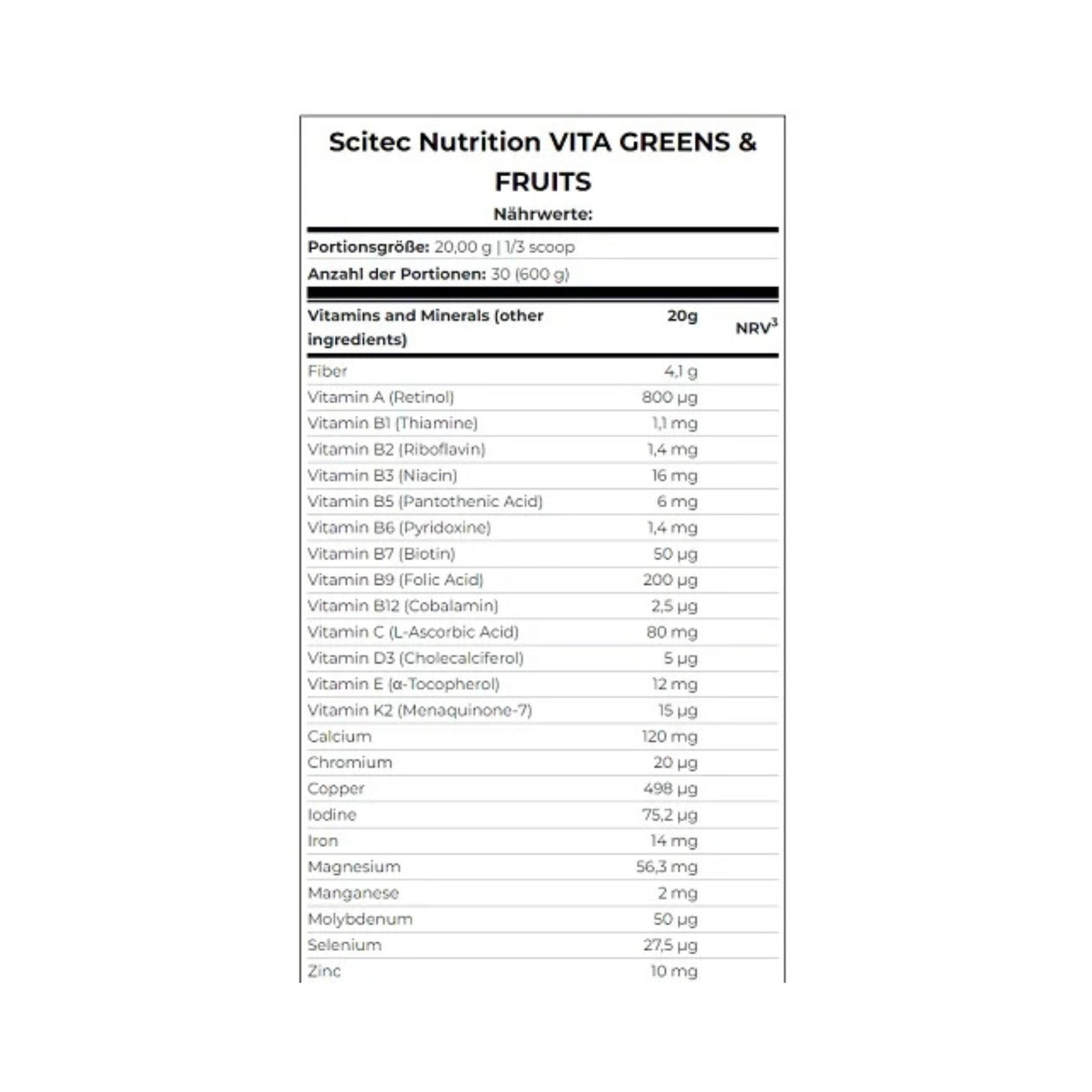 Scitec Vita Greens & Fruits ist ein pflanzenbasiertes Nahrungsergänzungsmittel zur Ergänzung der täglichen Ernährung. Die Greens-Formel kombiniert eine Vielzahl ausgewählter Gemüse- und Fruchtpulver mit Vitaminen, Mineralstoffen, Enzymen und pflanzlichen Extrakten.