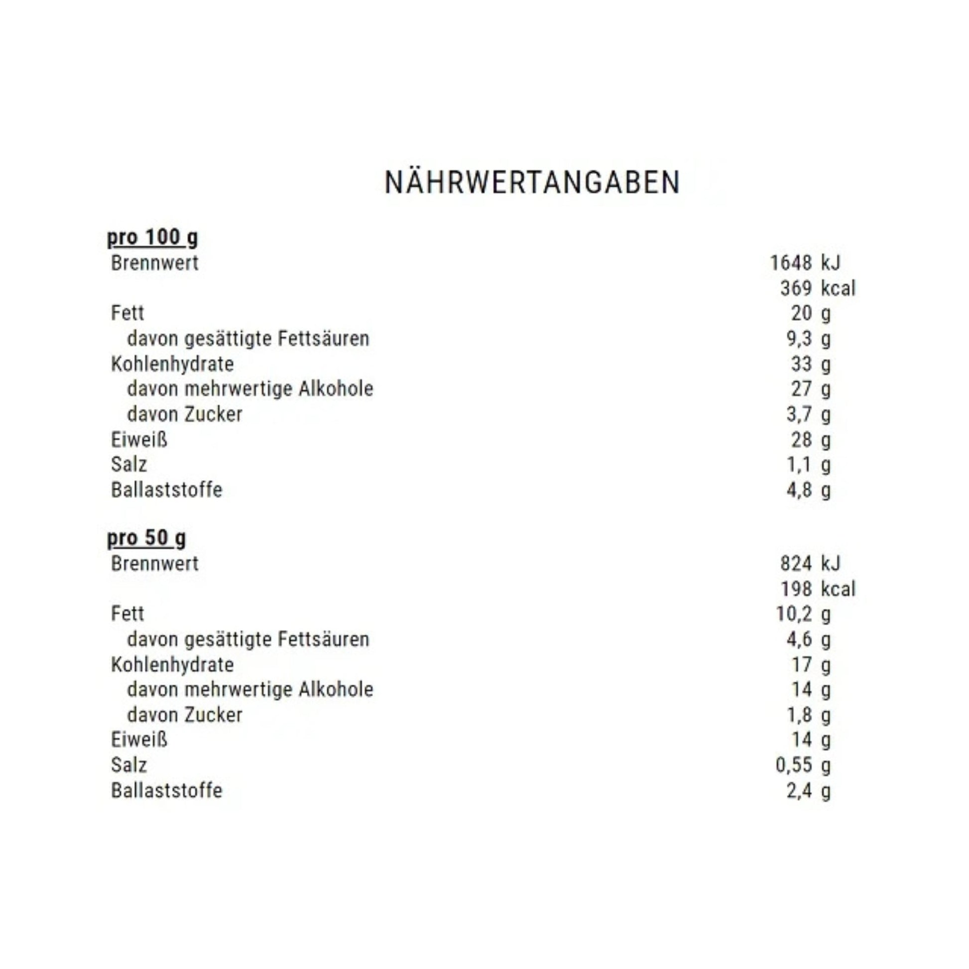 Vollmilchschokolade mit Süßungsmitteln (u. a. Maltit), Milcheiweiß, Feuchthaltemittel (Glycerin), Cremefüllung (u. a. Polydextrose, Maltit), Erdnüsse, Sojaeiweißcrispies, Kollagenhydrolysat, hydrolisiertes Weizengluten, Kakaobutter, Süßungsmittel (Maltit, Sucralose), Sojaöl, fettarmes Kakaopulver, Salz, Aroma, Emulgatoren (Lecithine).